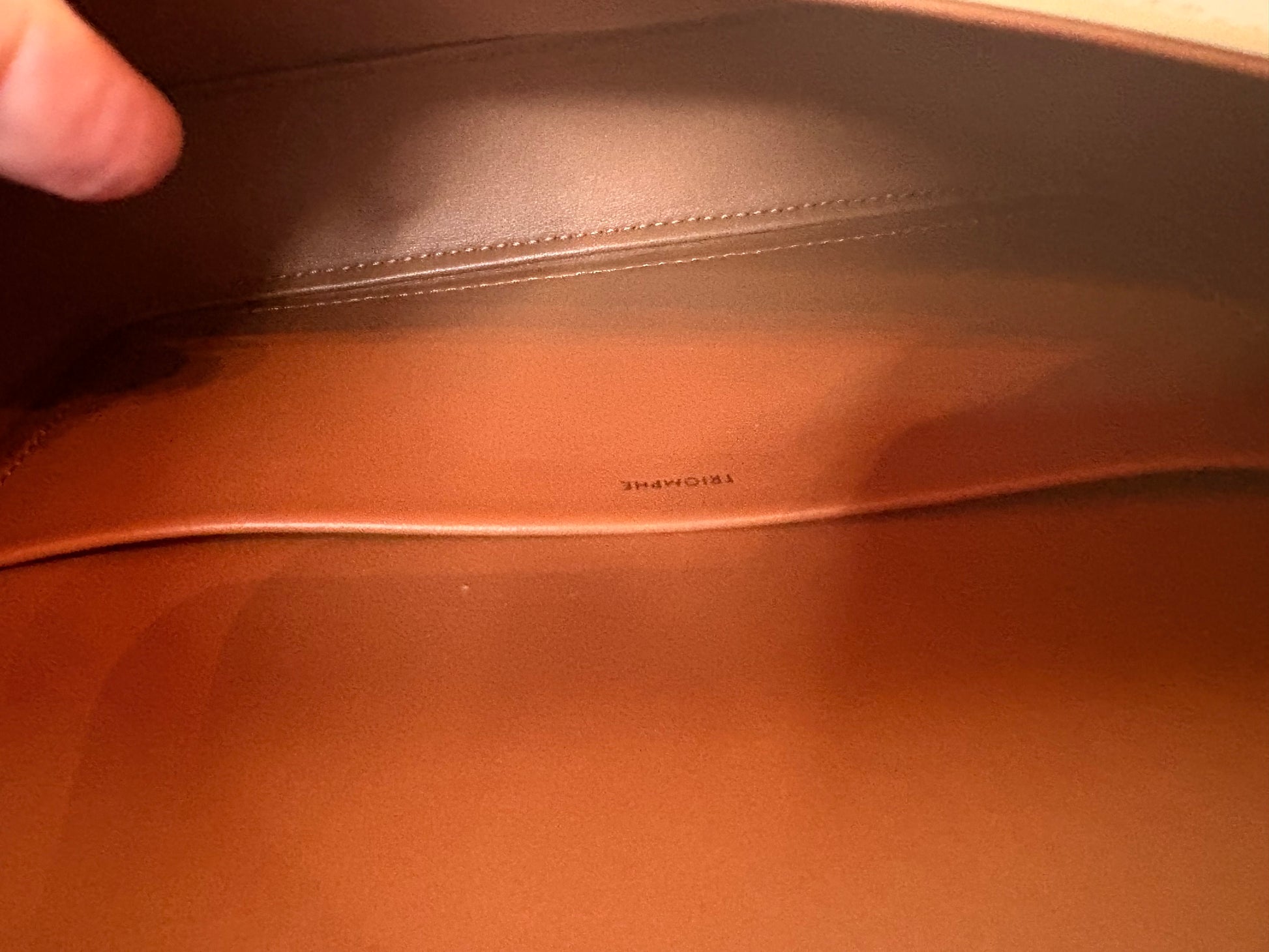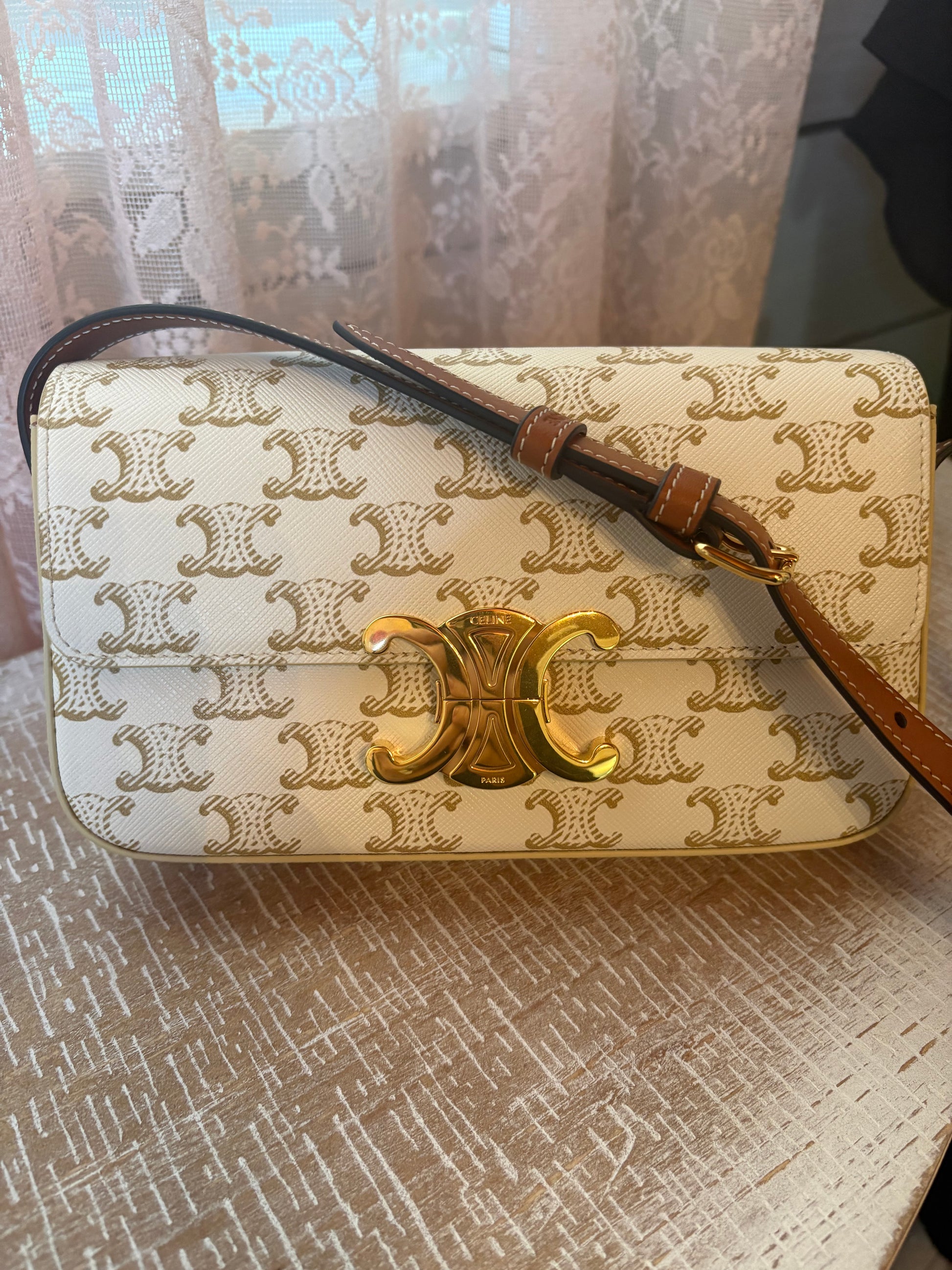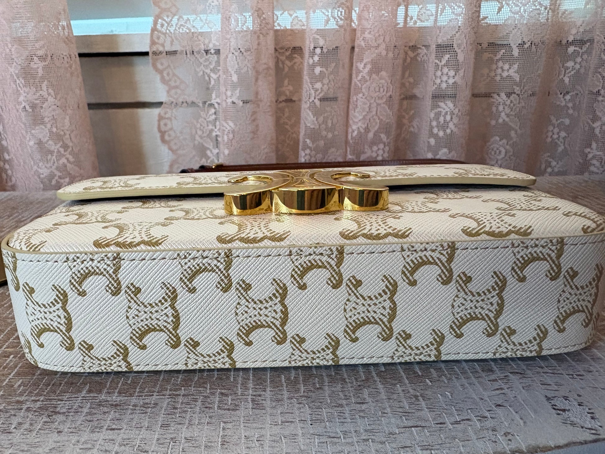 Celine Triomphe shoulder bag in canvas and calfskin leather. New without tags. Elegant white finish with signature Triomphe closure and a refined, structured silhouette.