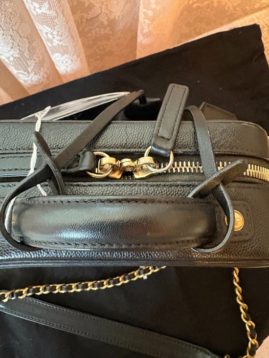 Preowned Chanel small CC Filigree vanity case in black caviar quilted leather. Excellent condition. Structured silhouette with iconic CC detailing and refined gold-tone accents.
