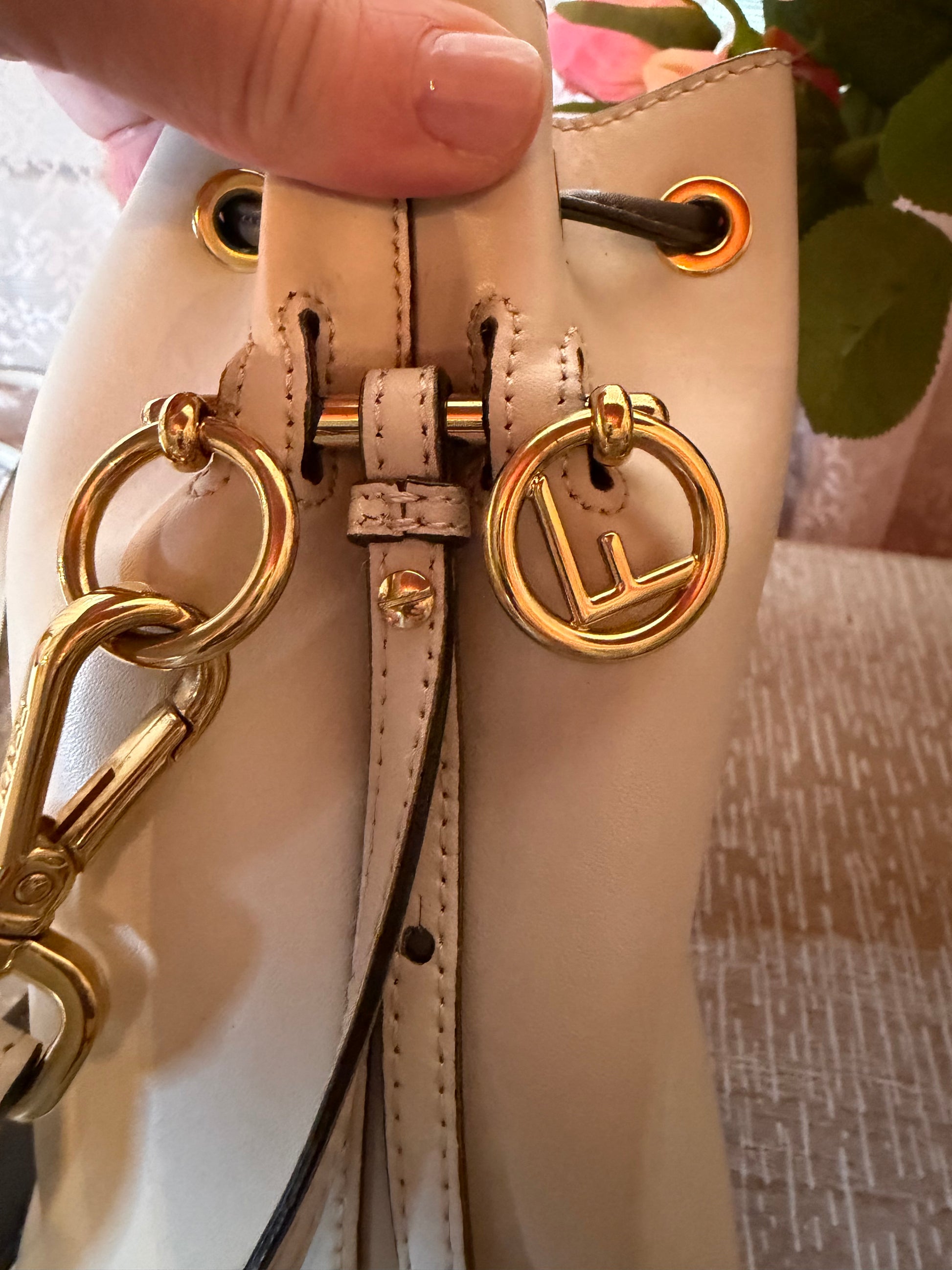 Preowned Fendi Mon Trésor mini bucket bag in white leather. Very good condition with light signs of wear. Iconic drawstring silhouette with a chic, versatile design