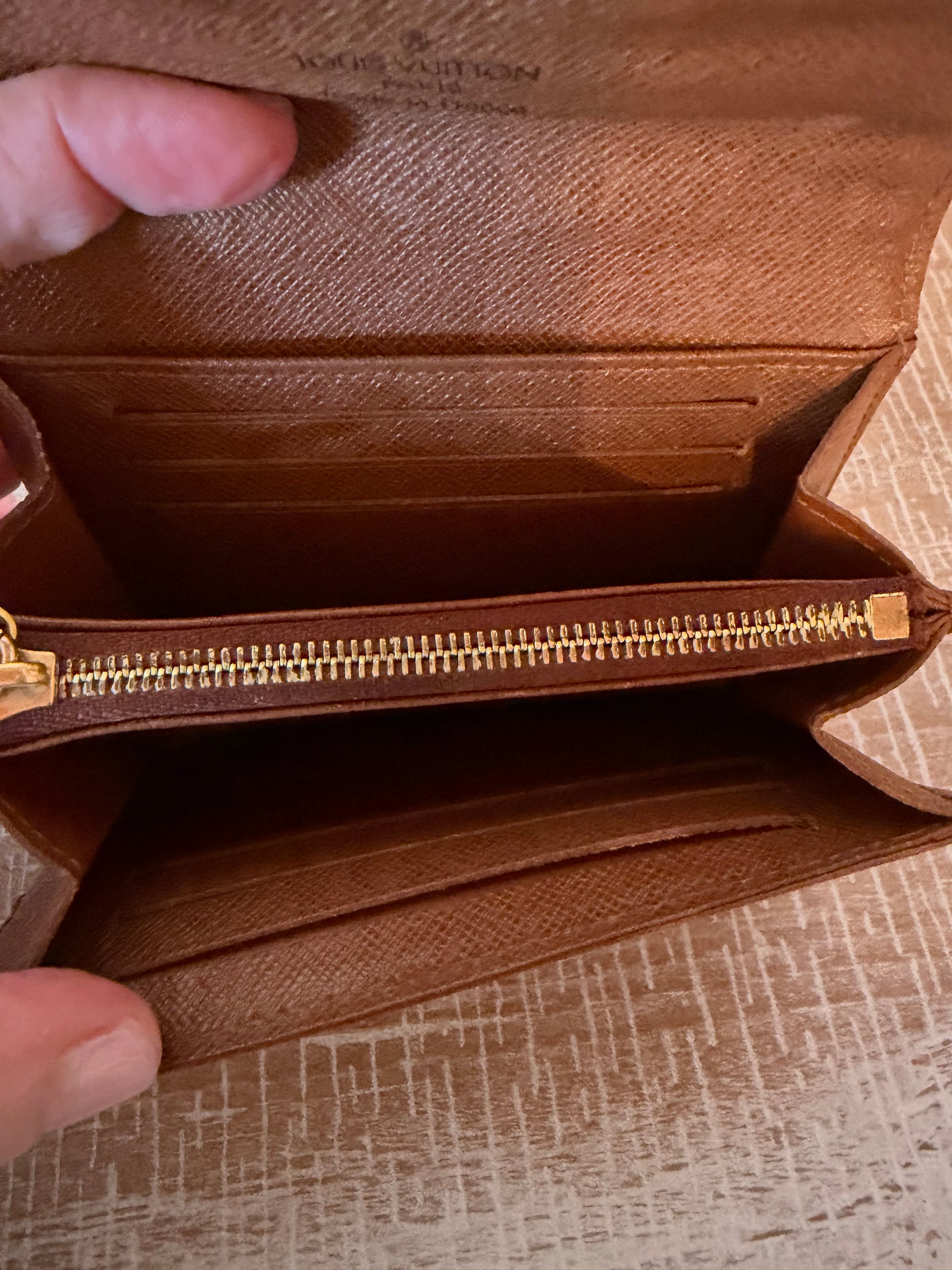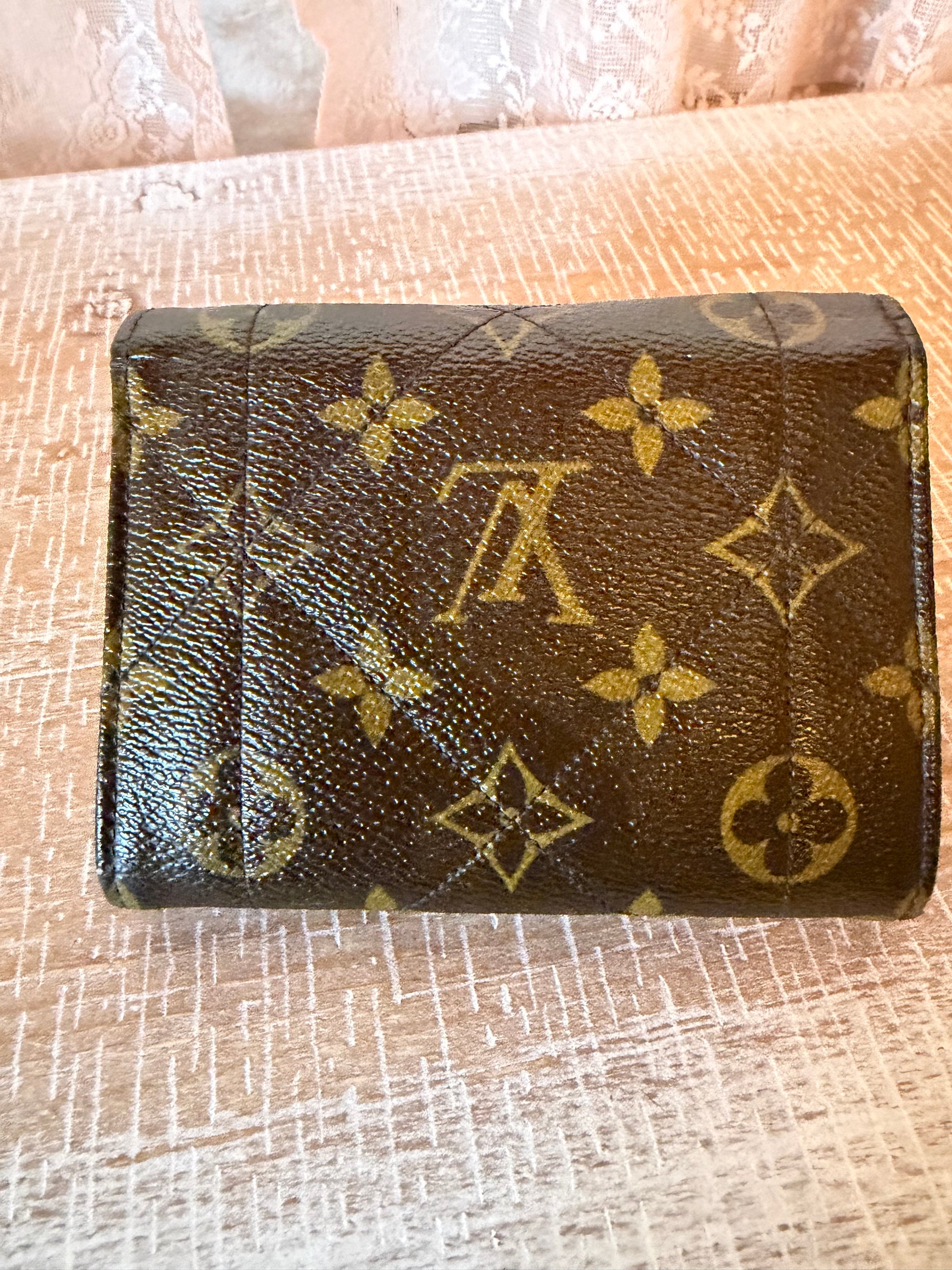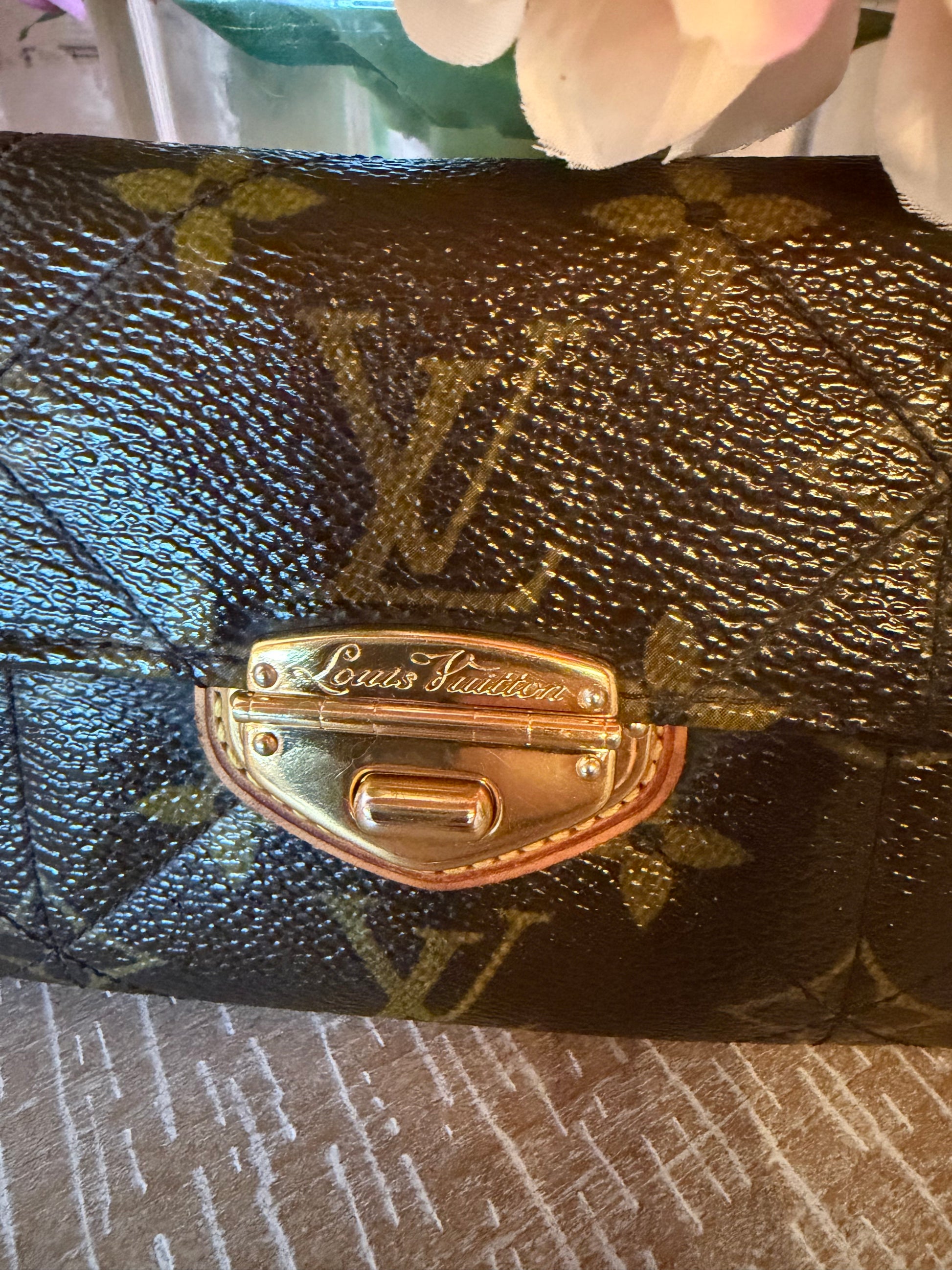 Preowned Louis Vuitton Etoile compact wallet in monogram canvas. Good condition with light signs of wear. Classic snap-front design with a functional, organized interior.