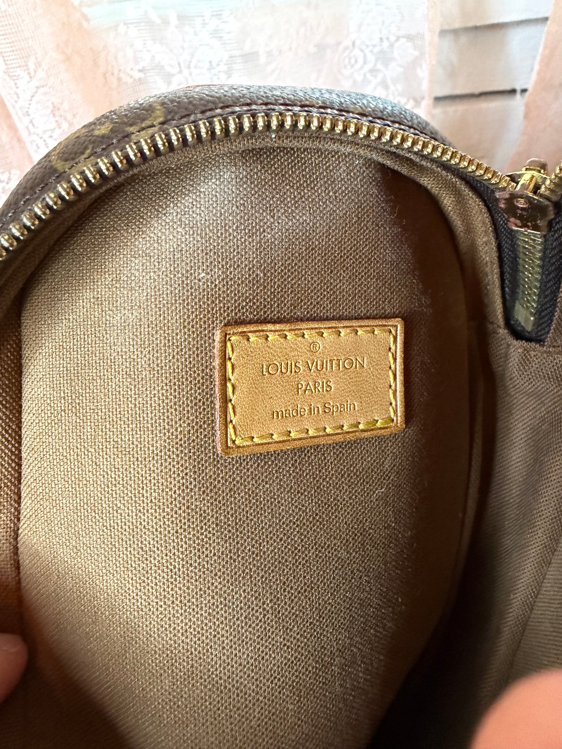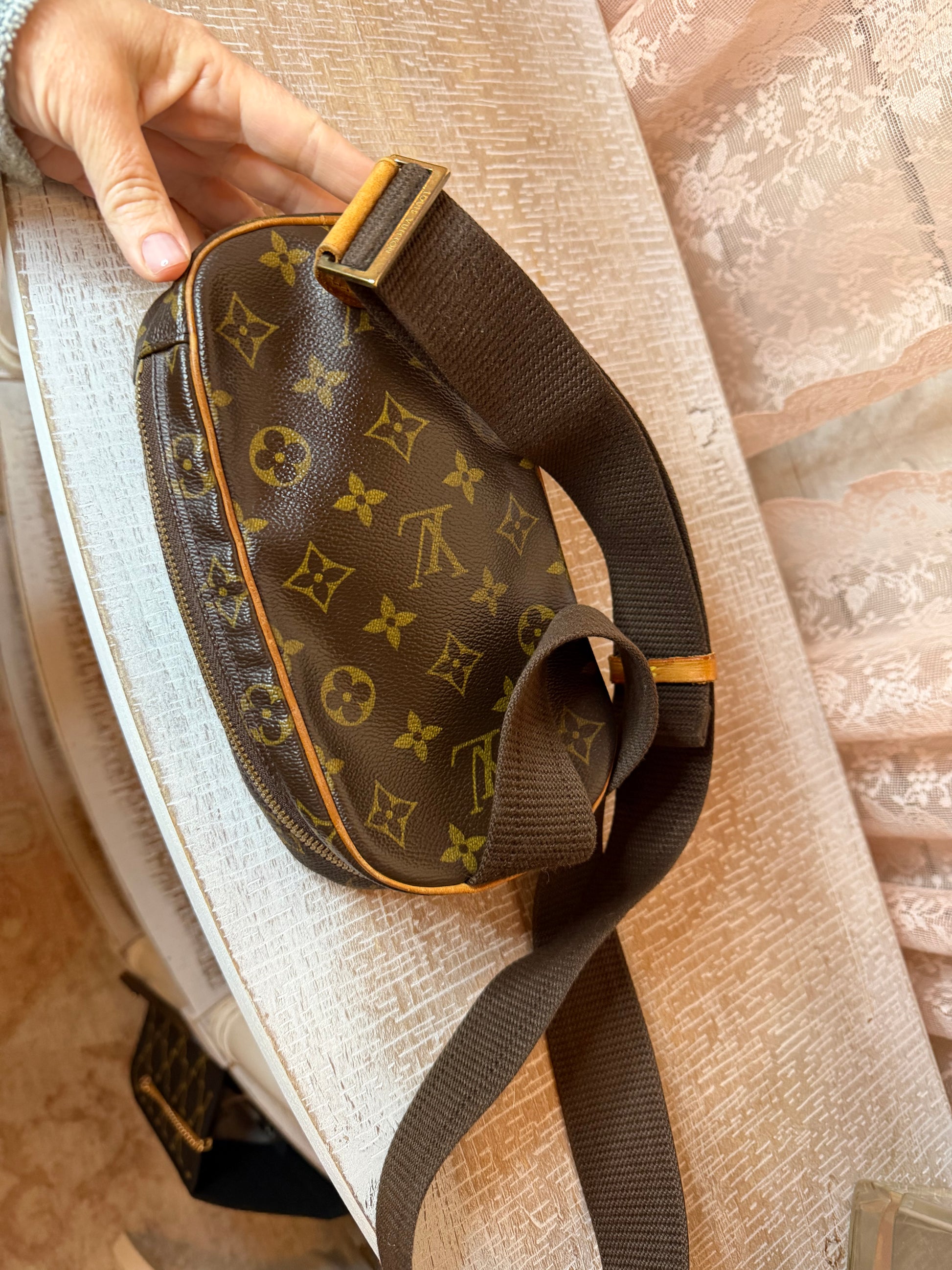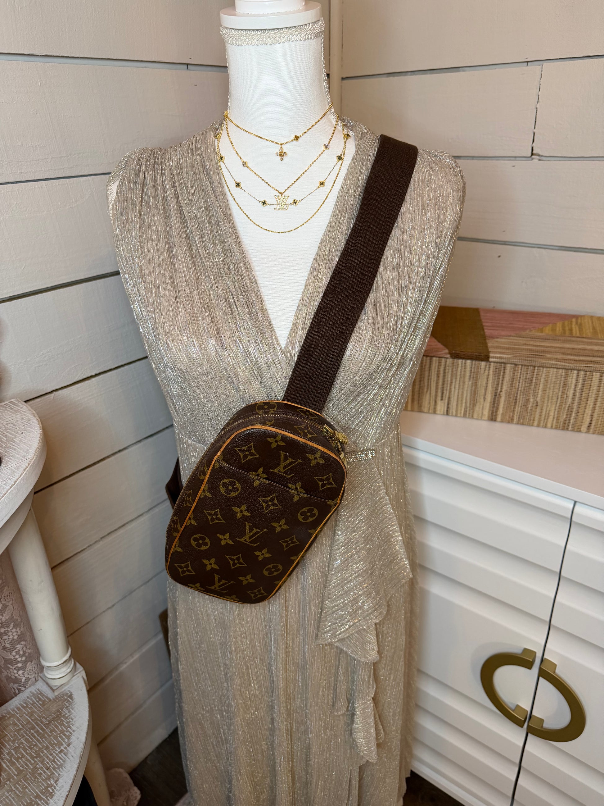 Preowned Louis Vuitton Pochette Gange in monogram canvas. Good condition. Rare find featuring a compact, hands-free design ideal for everyday wear.