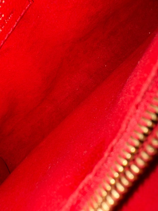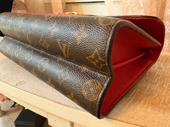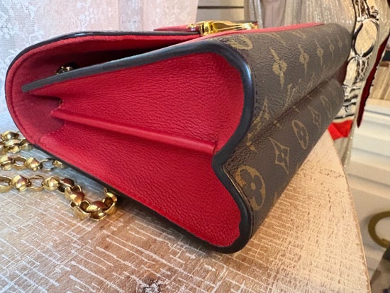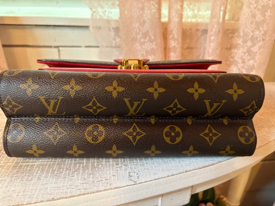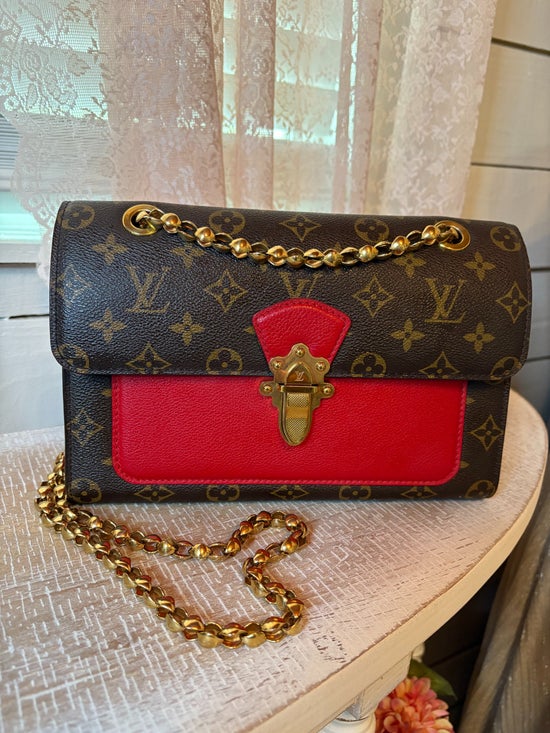 Preowned Louis Vuitton Victoire in red monogram canvas. Excellent condition. Sleek crossbody design with leather trim and gold-tone hardware for an elegant everyday look.