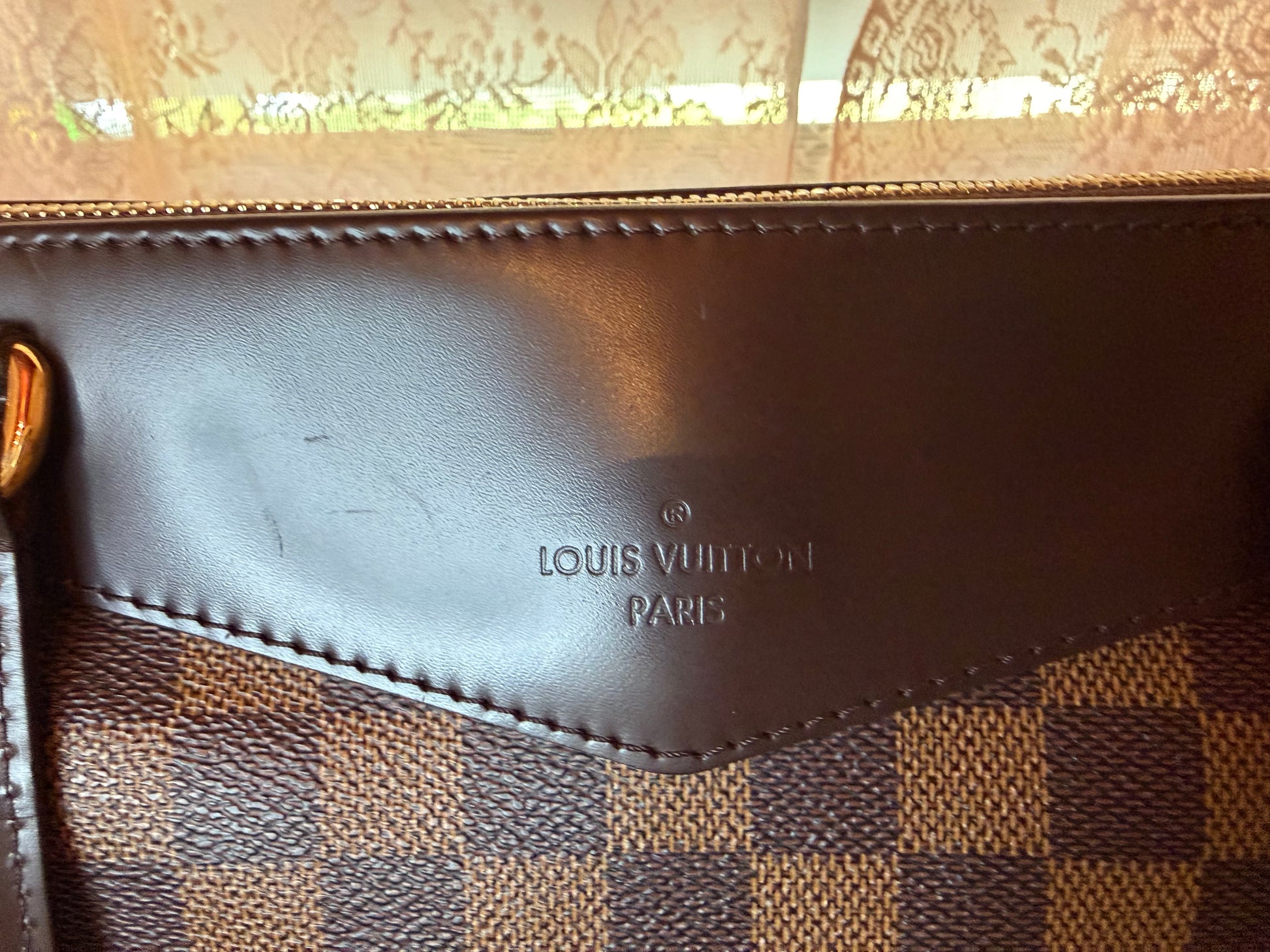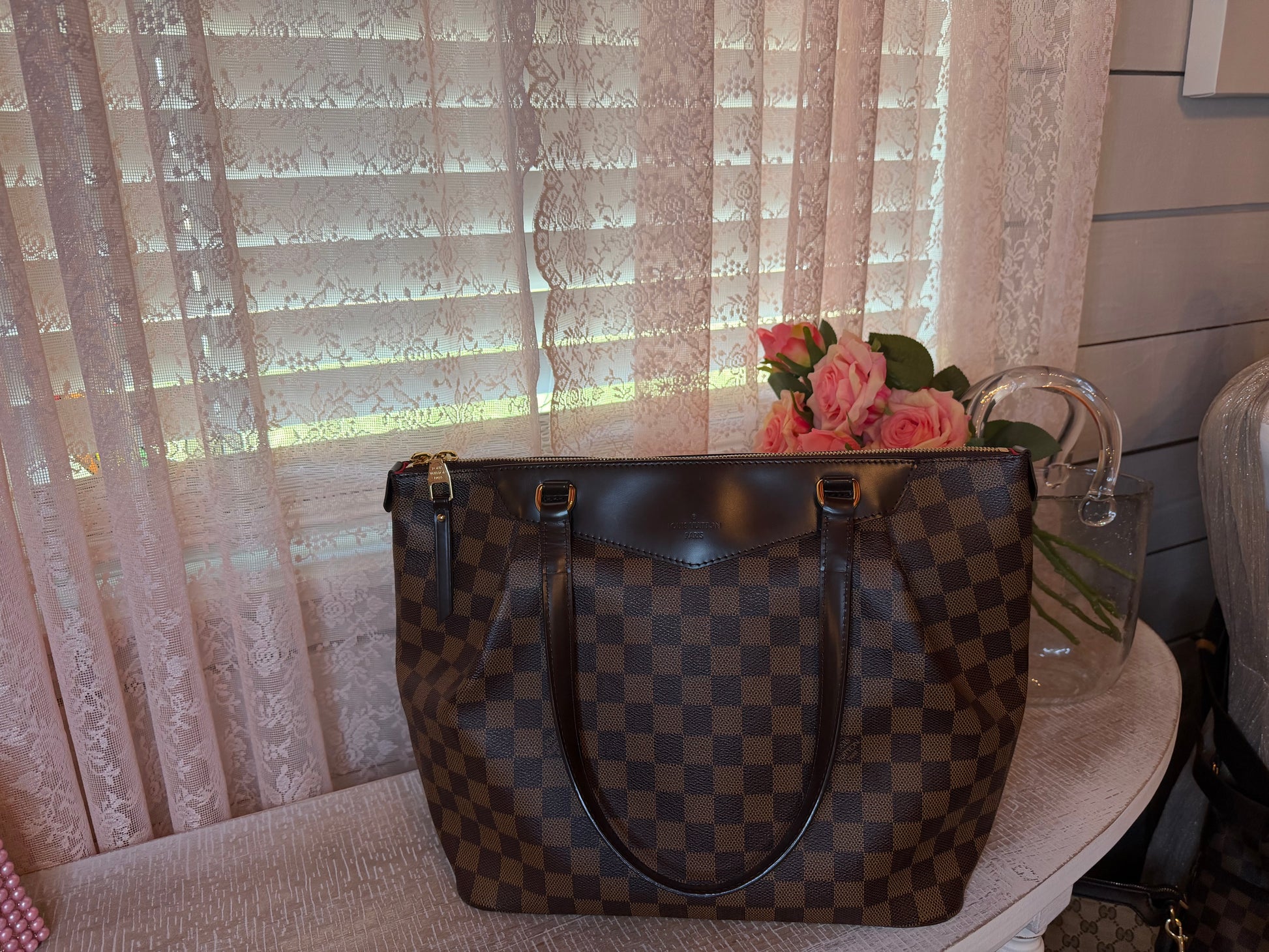 Preowned Louis Vuitton Westminster handbag in Damier canvas, GM size. Good condition with light signs of wear. Elegant, structured design with a spacious interior for everyday use.